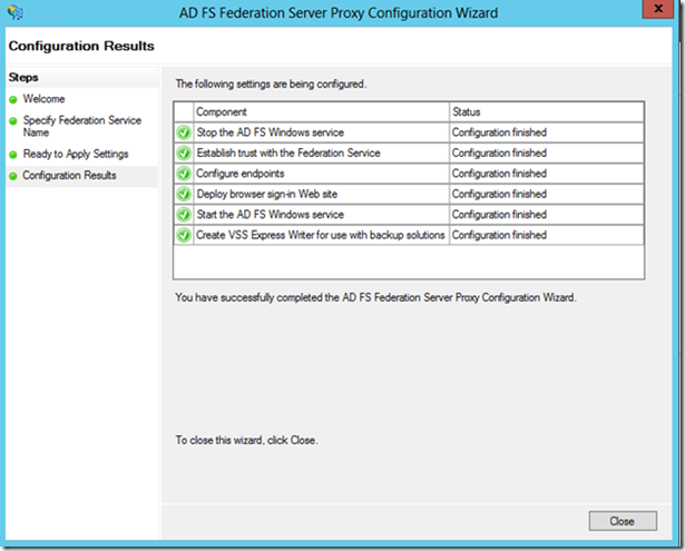 Alright you are done. The proxy is configured. A good way to “simulate” the proxy in a lab environment is to change your host file to resolve that name to the proxy instead of your internal adfs server. So after this post you should have a fully functional test lab that includes an ADFS server, ADFS Proxy and sample claims app. Don’t worry folks we are just getting started on this topic, if you have specific ADFS things you’d like to see covered or any comments let us know below.