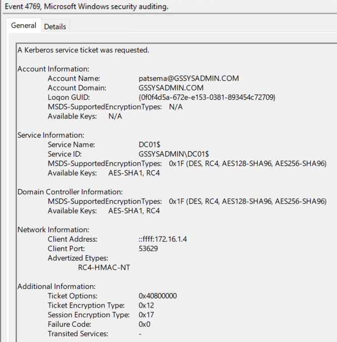 - Advertised Etypes: lists the encryption types the client supports. If you see only RC4 or DES in this field, it means that we are looking at a legacy client; modern clients should advertise both RC4 and AES.