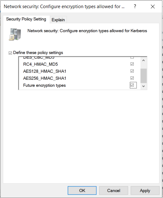 Note that, if you want to apply the msDS-SupportedEncryptionTypes to allow RC4 at AD object level, but at the same time have the DefaultDomainSupportedEncTypes set to 0x18 you’ll need to set the SupportedEcryptionType policy for the support of RC4 (more details in the scenarios section of this article).
