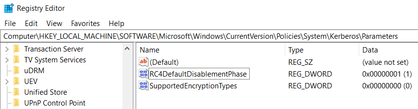 - DefaultDomainSupportedEncTypes: if the value of this key was not set when Phase 2 starts, the value is set to 0x18 by default (AES-only). You can roll it back to 0x1C or 0x24 (you will understand the difference between those two values later in this article) if needed. However, if you had previously defined this key, Microsoft will not override it.