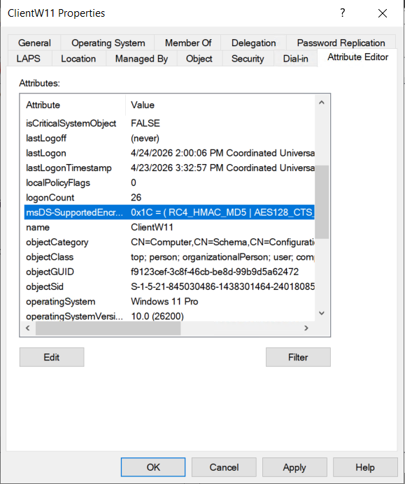 - msDS-SupportedEncryptionTypes: this attribute does not need to be changed in this scenario.