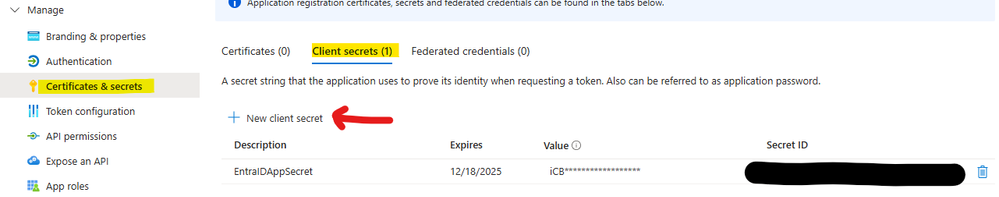 NOTE: remember when you create the app registration the client secret (Value) is shown only that time, after you move away from the app registration creation screen, the client secret will not be shown again. If you cannot grab the ClientSecret during registration of the app, you can click on the “New client secret” button from the view, create a new client secret and delete the previous one.