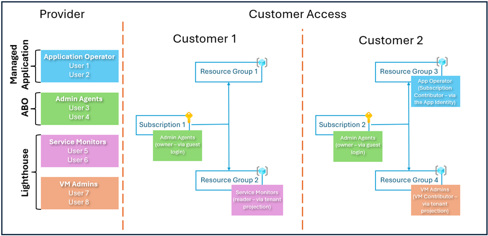 - AOBO – Access is granted via individual RBAC assignments to guest users. Providers juggle multiple customer tenants and must maintain least privilege manually. Customers must remove each role assignment if they want to revoke access to services.