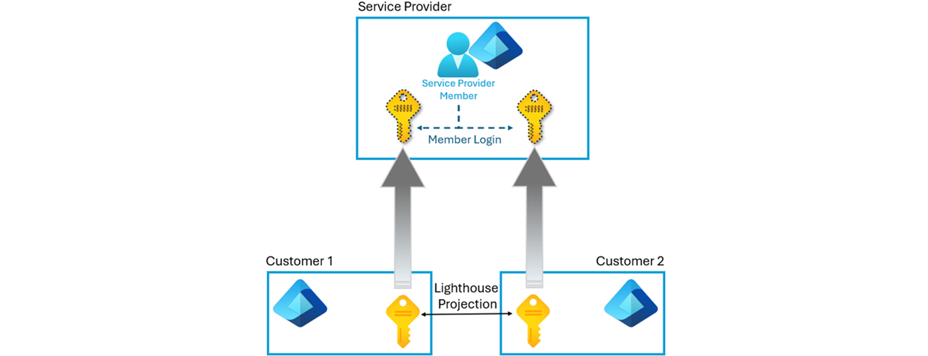 Figure 2: Access subscriptions across Entra tenants using Azure Lighthouse, with your member login account in the Service Provider tenant.For clarity and simplicity, this article uses variations of two consistent terms. The Service Provider refers to the managing entity, or the tenant that contains the identities used to manage resources in another tenant. The Customer refers to the entity whose resources are being managed. Accordingly, the tenant hosting those managed resources is referred to as the Customer Tenant, while the tenant hosting the managing identities is the Service Provider Tenant.