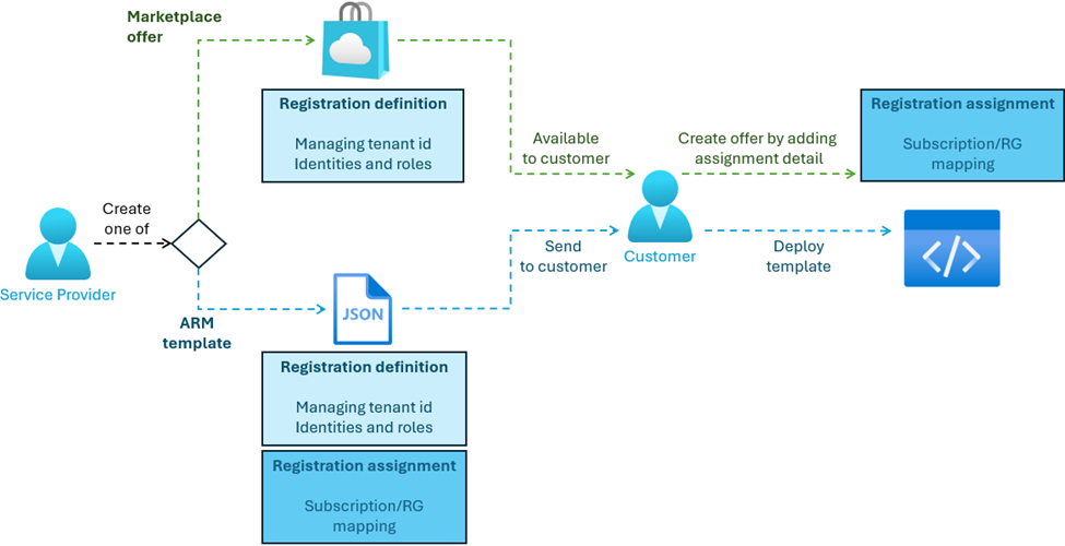 - Managed service offer via Azure Marketplace – Partners who meet competency requirements can publish public or private offers in the Azure Marketplace. Customers accept the offer via the Marketplace, which automatically deploys the registration definition and assignment into their tenant. Offers apply identically across all purchasers. To customize roles for specific customers, you must publish separate private offers or use the ARM template method.