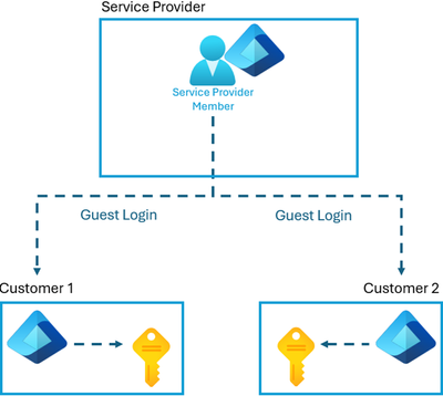 Guest accounts with manual role assignments in the customer tenant; cross‑tenant administration is done via individual RBAC assignments. |