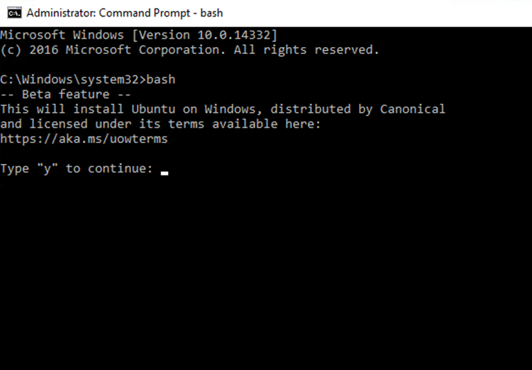 Once you have confirmed that the computer is in the Fast ring and you have received Build 14136 or newer, you can proceed with installing the Bash shell in windows.
