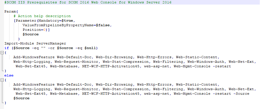 Maybe this has been already blogged, but in the attempt to make IT guys' life easier I want to share a small Power Shell script which I Used to install the necessary Web Console prerequisites for System Center Operations Manager 2016 on Windows Server 2016 .