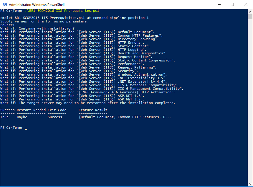 If you want to test it before running in Prod, you can add the -Whatif switch at the end of the Add-WindowsFeature command line and you will get something similar to the screenshot below wit some nice info at the end: