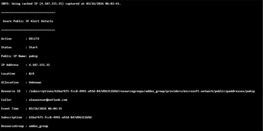 Although the delete alert contains only the Resource ID, the runbook retrieves the exact assigned Public IP address from the cache.