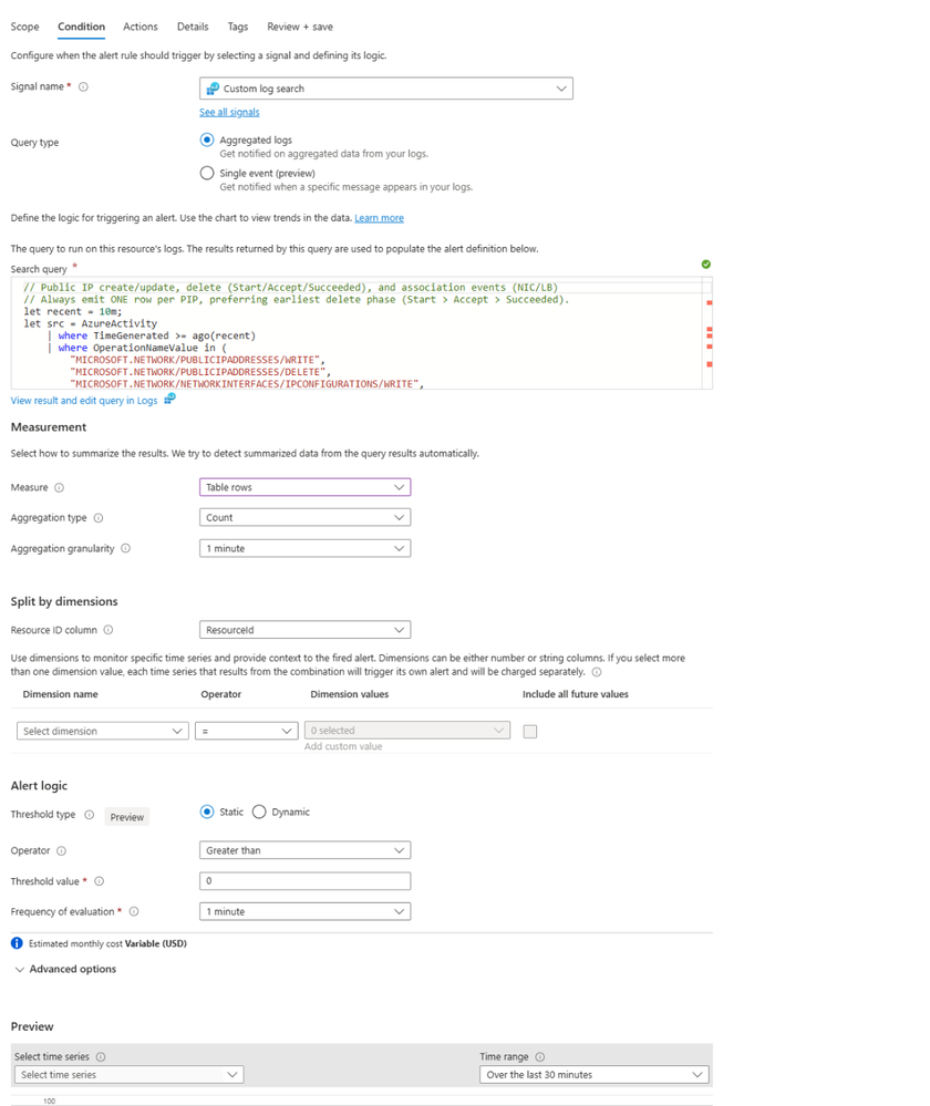- Log Analytics alert rules detecting Public IP lifecycle operations
