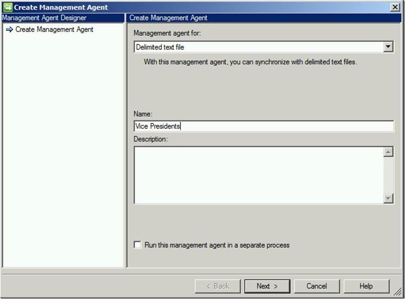 From here, click “Create”. Using the “Management agent for:” drop down menu, select “Delimited text file”. Enter a name, then click “Next”.