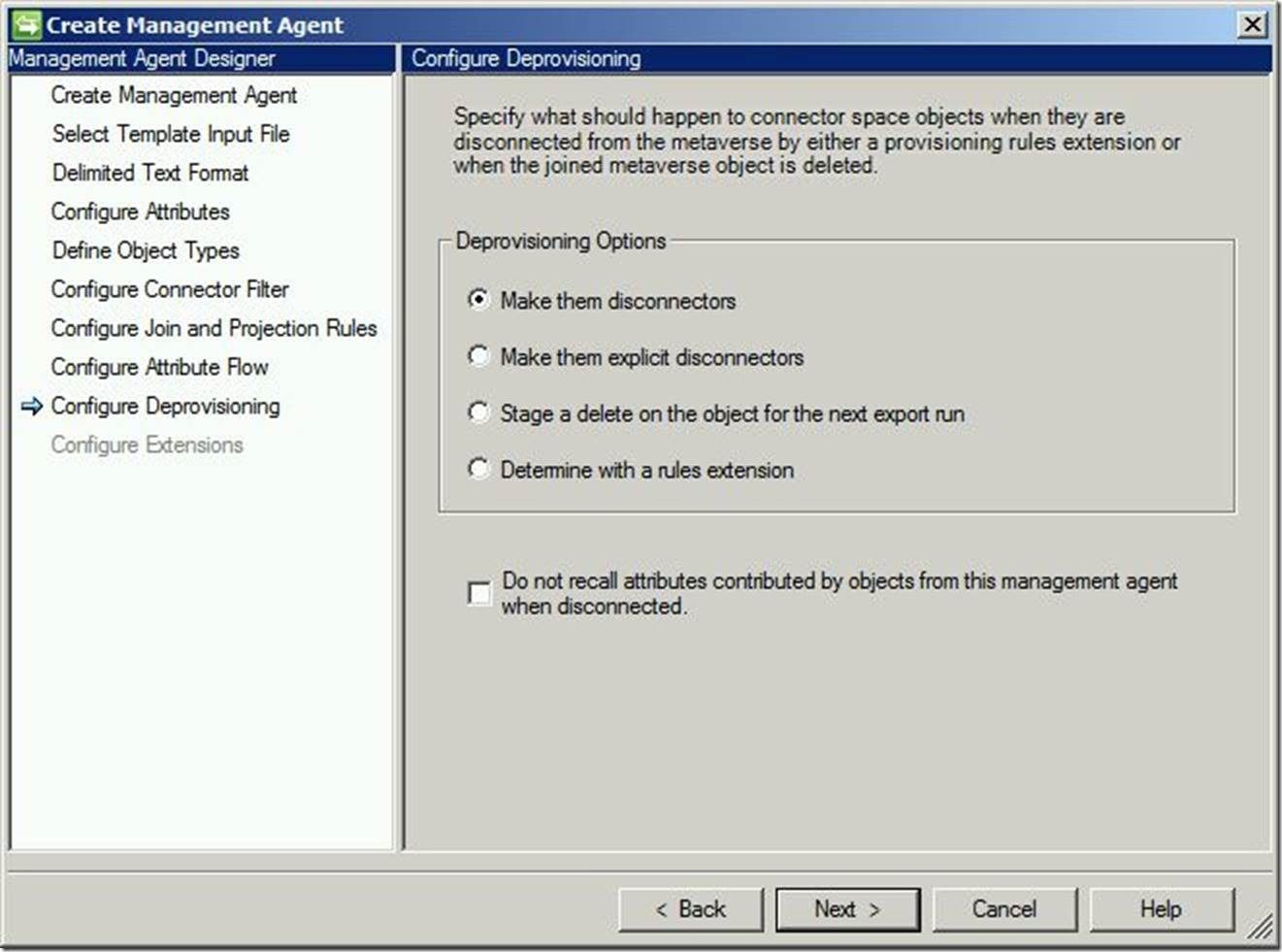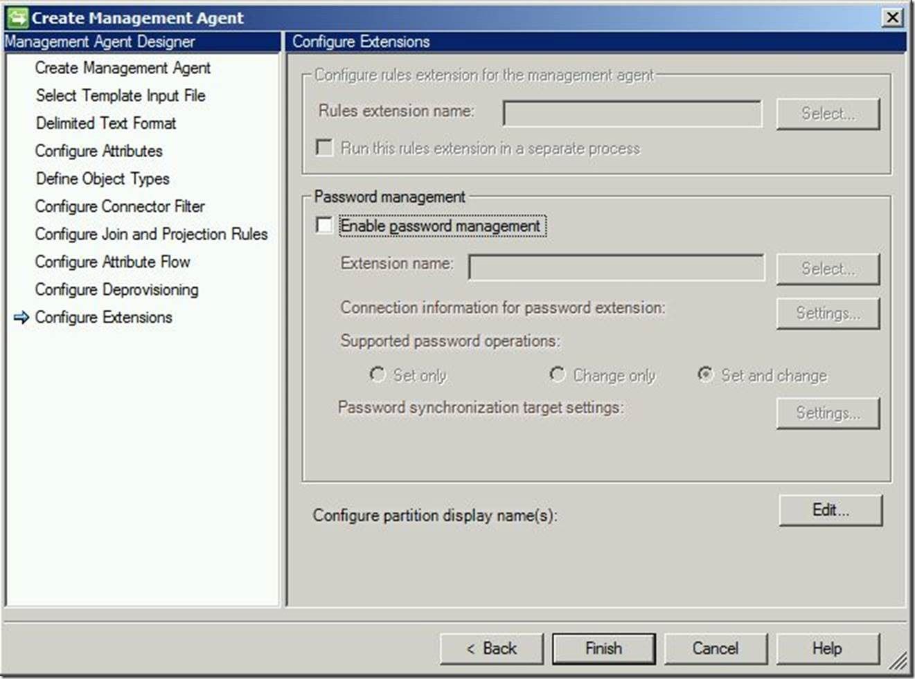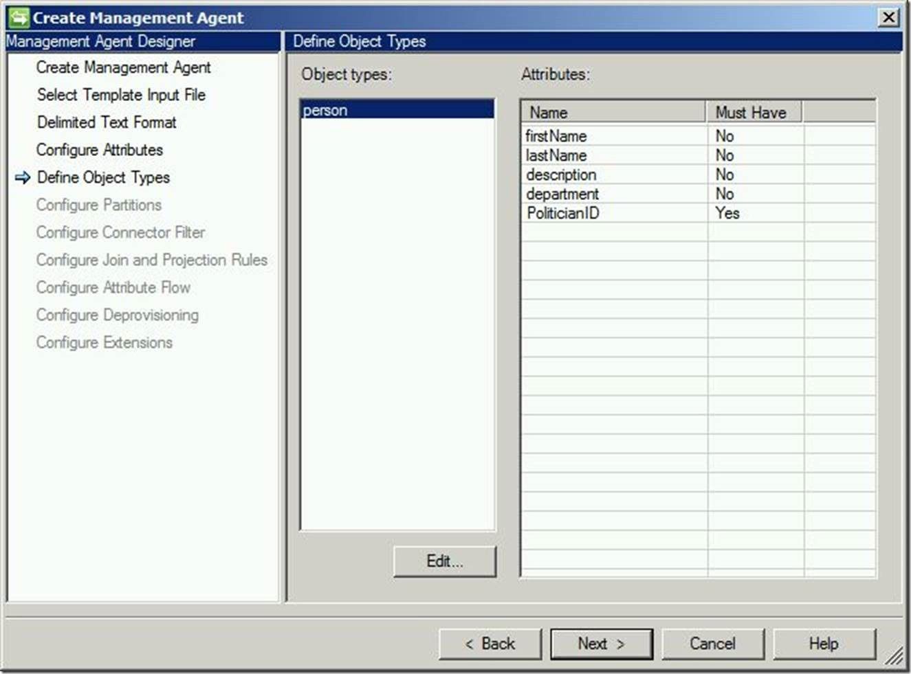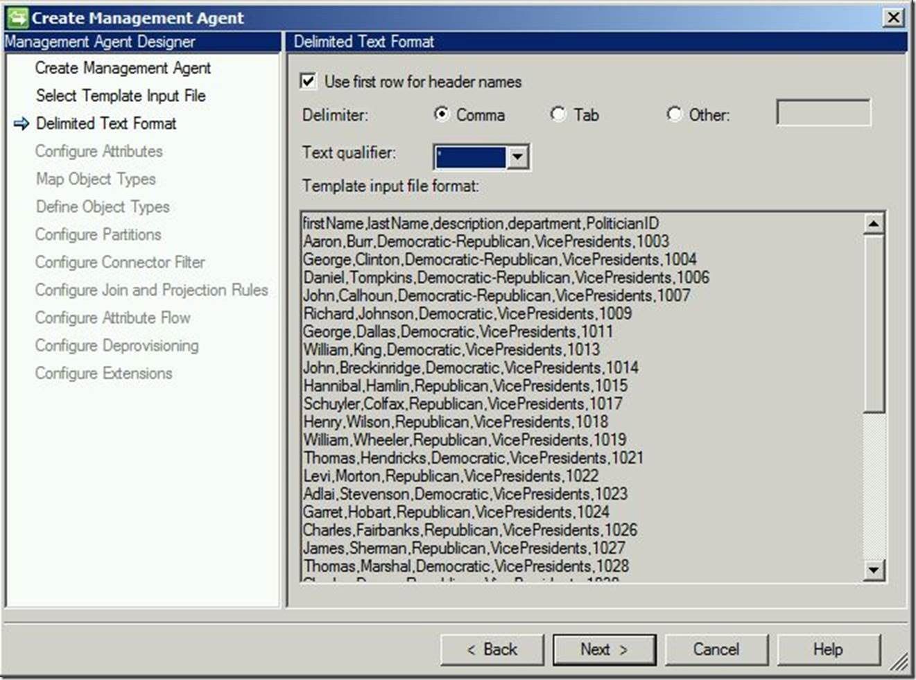 This is Part 4 in a series of commonly used management agents. In Part 1 we looked at configuration of an Active Directory Management Agent (ADMA); in Part 2 we looked at the configuration of the FIM Service Management Agent (FIMMA), and in Part 3 we looked at the configuration of a Microsoft SQL Management Agent (SQLMA). With this post, we’ll take a look at delimited text file management agents.