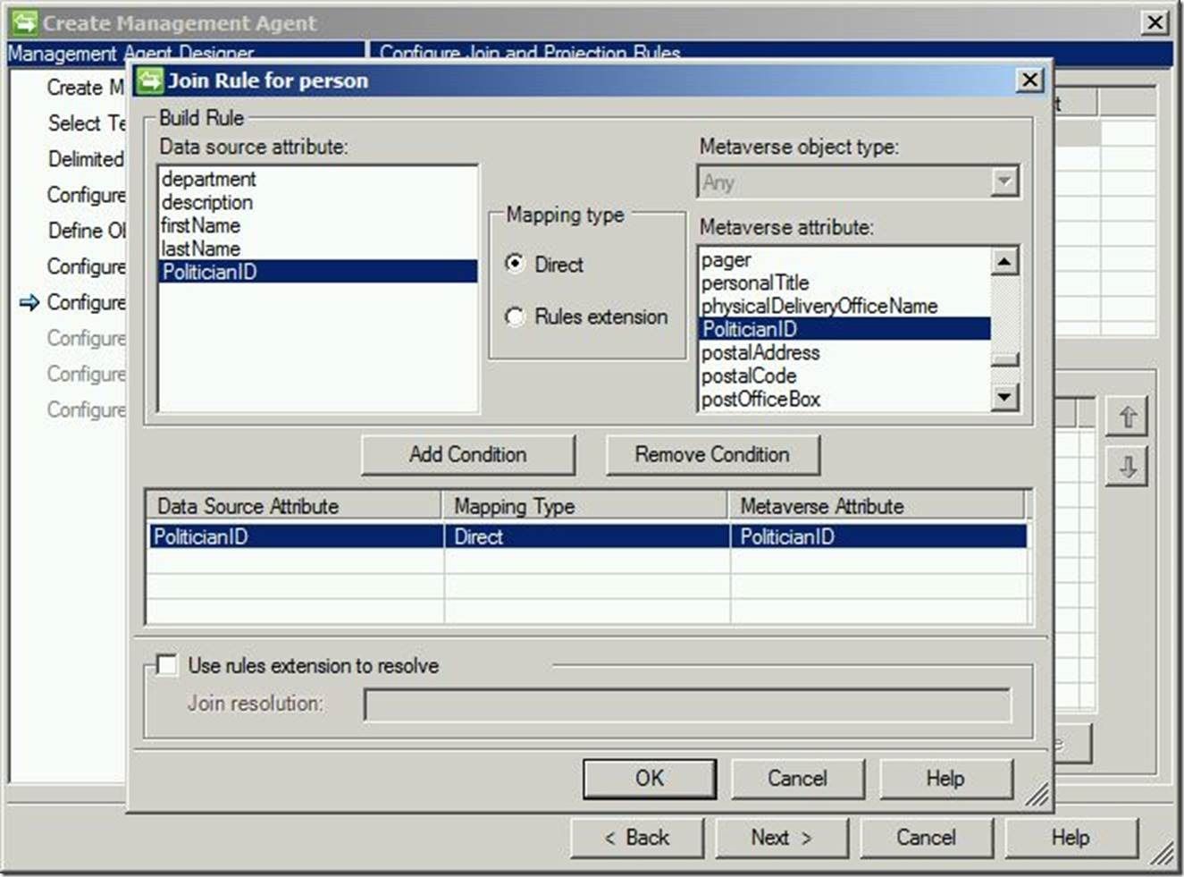 In this scenario, I am creating a “Direct” join mapping of “PoliticianID” to “PoliticianID”. This is because I know (in this environment) it is unique for every user object. Click on “Add Condition” and then click “OK”. Click “Next” to continue.