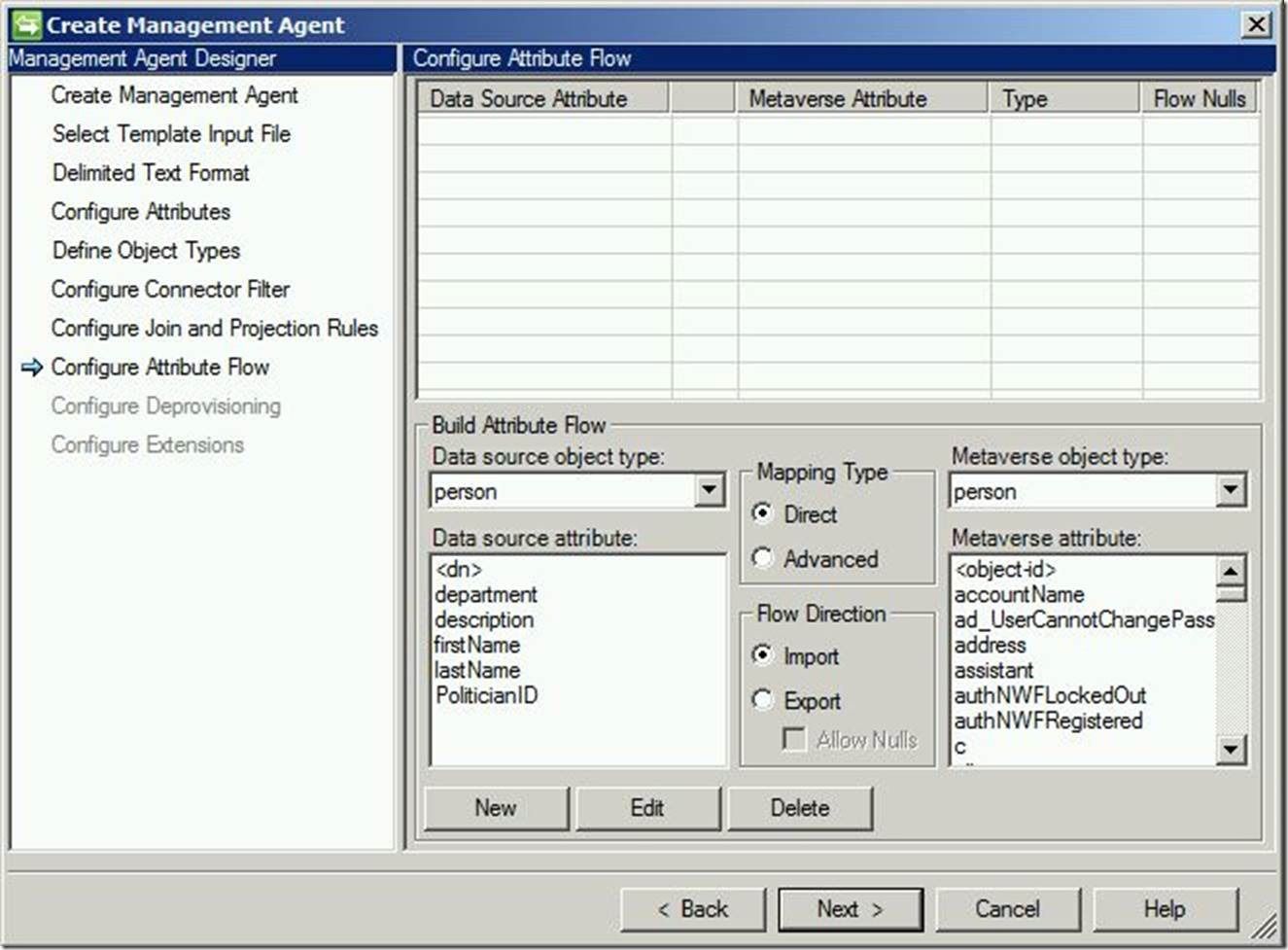For “Configure Attribute Flow”, we will leave this default. By doing so, we will pull all available attributes from the source file into FIM and then manipulate them there (based on workflows, sets and synchronization rules). Click “Next” to continue.