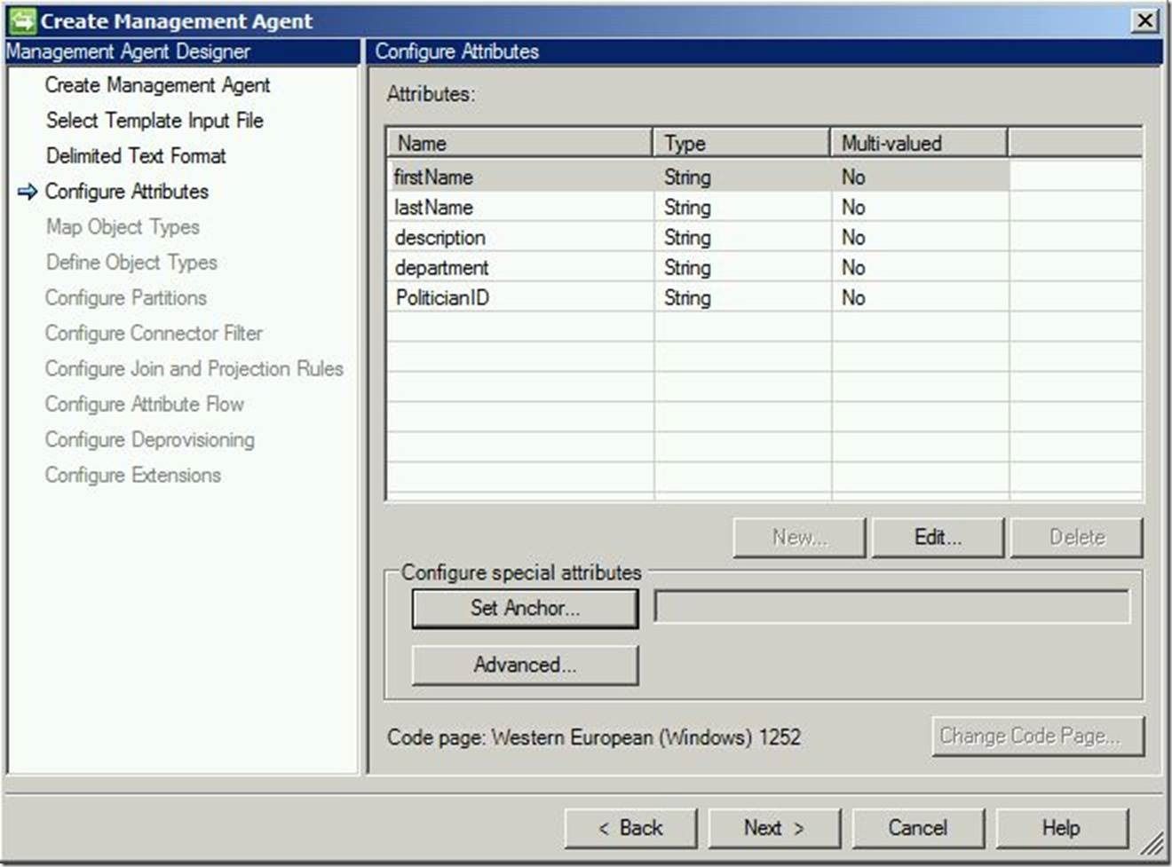 Here we should see all the attributes being read in from the file. If any of these are multi-valued and need to be changed, select “Edit”. Also, under “Configure special attributes”, select “Set Anchor…”
