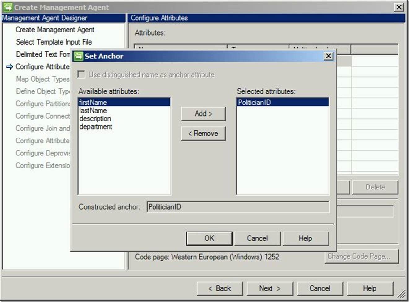 This will display the “Set Anchor” dialogue. Select an anchor attribute from the left-hand list and click “Add”. Note that an anchor attribute must be present and unique on each side (i.e. text file as well as inside FIM). Once selected, click “OK”.
