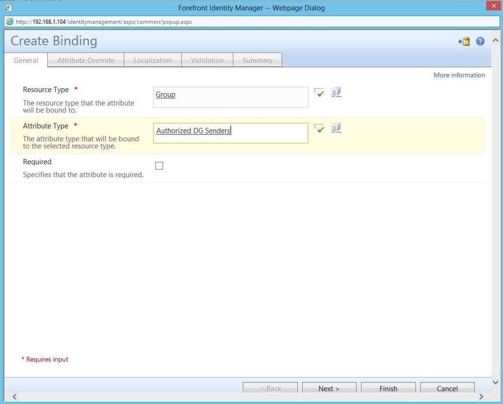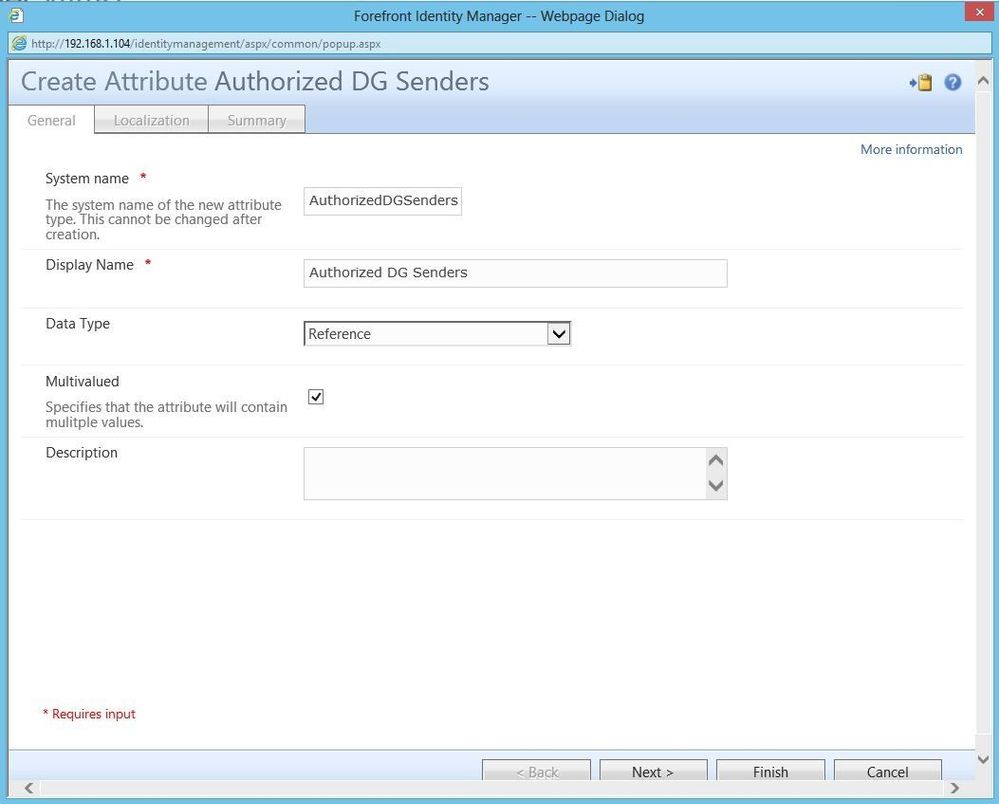 First, we need to create a custom attribute. For detailed instructions on creating and binding a custom attribute in the FIM portal, please see this document . For reference, here’s what the custom attribute needs to look like: