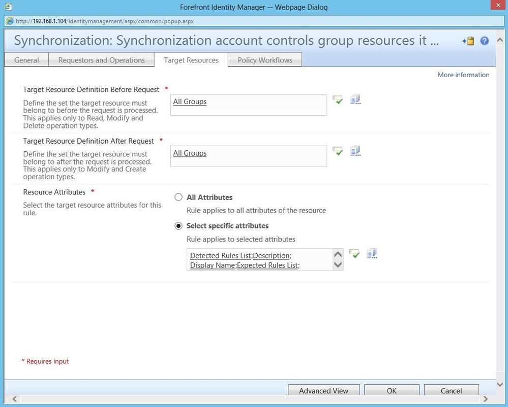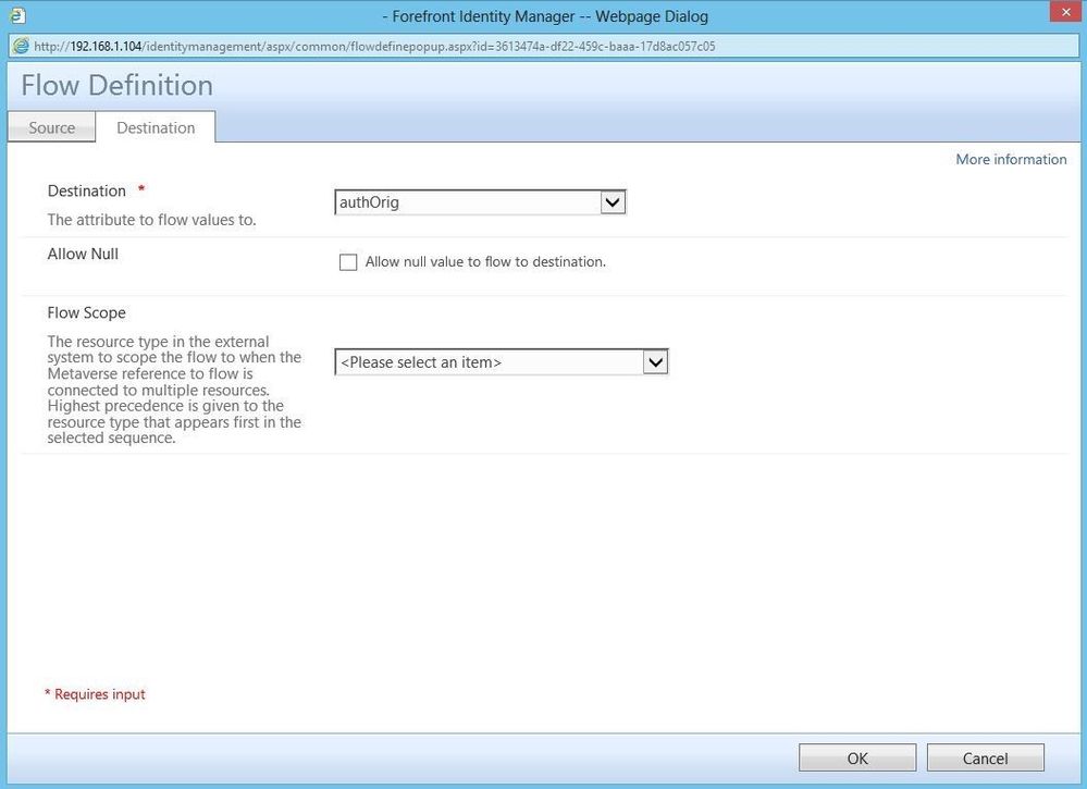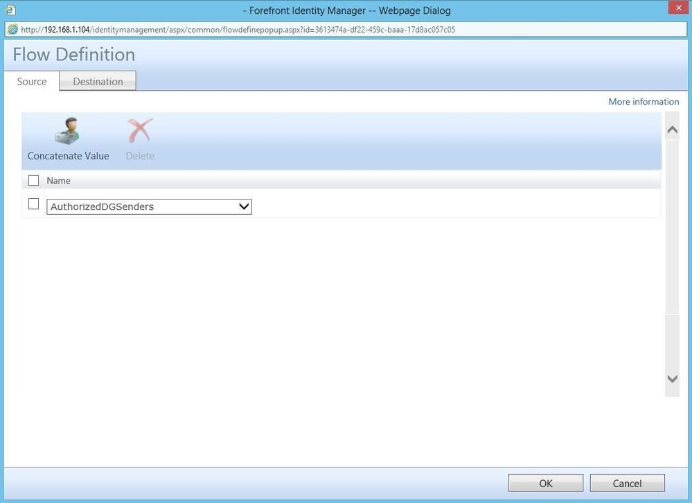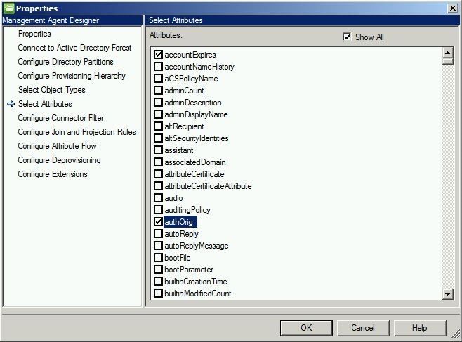 When configuring “send to” permissions in Exchange via the Exchange Management Console, the data is actually being stored in an attribute in AD. Therefore, we need to bring that attribute into scope for FIM. This can be done on the Active Directory management agent. The required attribute is authOrig .