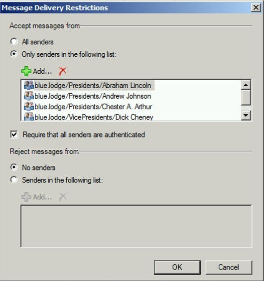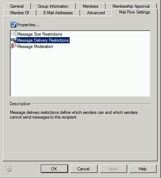Here we see the “Message Delivery Restrictions”. In this case, only the listed users are authorized to send email to this DG.