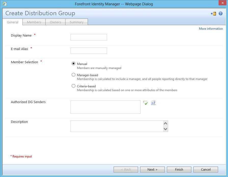 So we all know FIM is great at managing the lifecycle of a user, handling their group membership and even allowing for password self-service. However, FIM’s capabilities (especially with regards to self-service) don’t end there. One of the great things about this technology is the ability to customize and build on what you get out of box. A great example of that is Distribution Group (formerly Distribution List) self-management. As a large organization, I may very well have thousands (if not tens-of-thousands) of distribution lists in Exchange. And while it is true that I, as a group owner, can add or remove members from my group natively through Outlook, what about other administrative tasks? What if, for example, I want to control the permissions of who is allowed to send to that group? Typically, this would require a ticket with the Exchange team. With FIM, however, we can build this functionality directly into the Portal and allow users to manage their own groups.