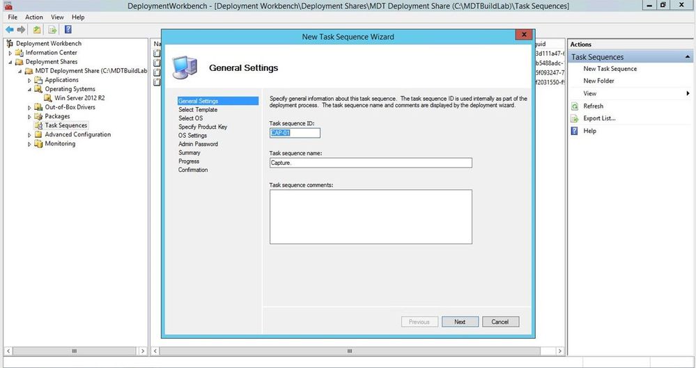 A Task Sequence is an ordered list of actions that you want MDT to carry out such as an OS deployment or an OS capture. The power of MDT is in the depth and breadth of what those actions can be. We can set the time zone, join a domain (and even the OU), install applications, driver packs, etc.