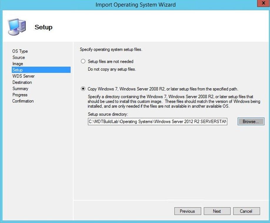 Select to copy setup files and browse to the location of your imported RTM OS media files