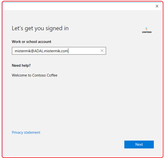 We configure the Delegate Login Identity to deconstructs and craft the username part of the user principal account. ( MisterMik@ADAL.mistermik.com ).