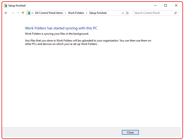 Configuration is completed in a few seconds. Data from the server location will get synchronized to the specified folder on my client. Again, this data will be stored in an encrypted way (hence the green color in file explorer when viewing the folder).