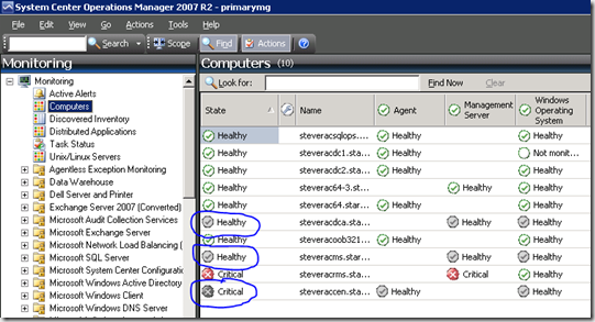 Monitoring for agent heartbeat failures is a built in function in OpsMgr. Heartbeats ensure that agents running in the environment are available and that the agent is able to interact with it’s management server. All agents, regardless of whether on a server or workstation class system, participate in sending heartbeats. An agent that is not sending heartbeats is noted in the OpsMgr console in a ‘grey’ state.
