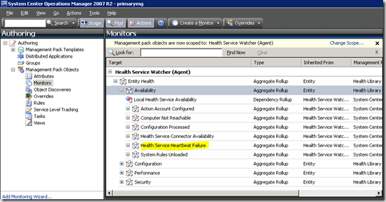 An agent heartbeat failure is detected by the ‘Health Service Heartbeat Failure’ monitor. Note that this monitor is an aggregate rollup.