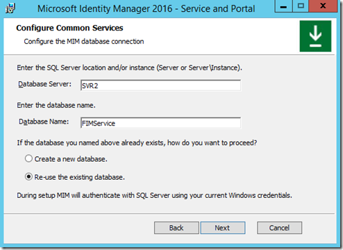 Verify that you select the “Re-use the existing database” option if you are installing against an existing FIMService Database.