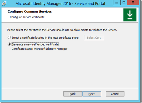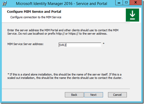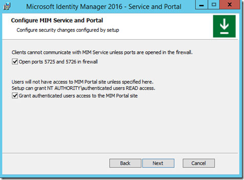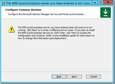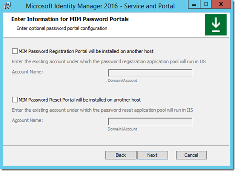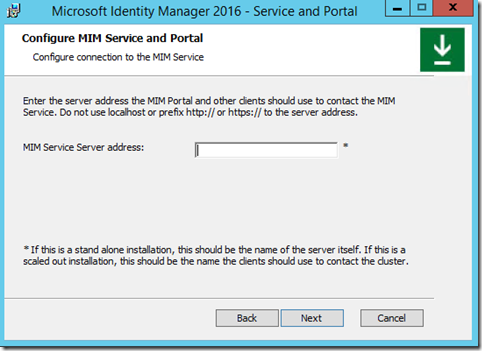 The next window you should see if the Synchronization Server was correct is the MIM Service and Portal configuration window.