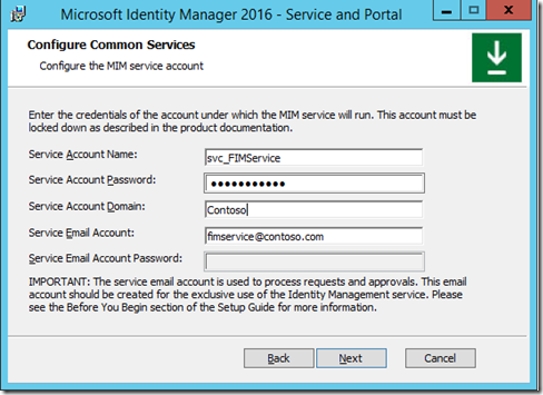 This next window you will need to enter the Service account information that will be used for the MIMService , if you are installing this against a preexisting FIMService Database use the Service account used previously.