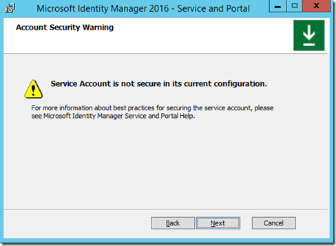 This warning states that the Service Account is not secure in its current configuration, ( See additional configuration guide)