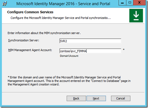 You now need to enter the Synchronization Server info including the name of the service account of the FIM / MIM MA