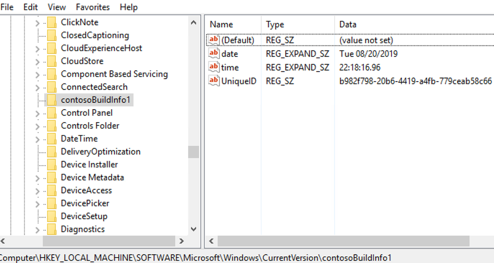 REG ADD HKLM\SOFTWARE\Microsoft\Windows\CurrentVersion\contosoBuildInfo1 /v UniqueID /t REG_SZ /d "b982f798-20b6-4419-a4fb-779ceab58c66" /f