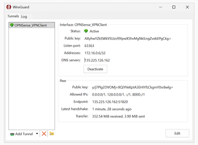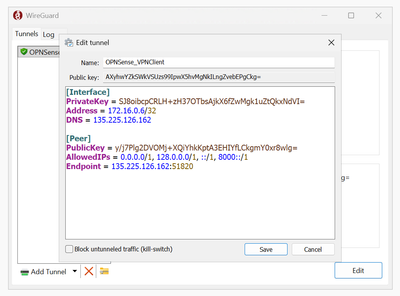 Launch WireGuard application, click on Add Tunnel > Add empty tunnel..., then paste the peer configuration generated from OPNsense and save it.