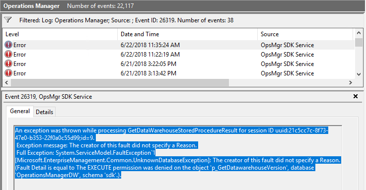 What will surprise you is that among all these instances, there are some of them which have an interesting description. They report about the lack of permissions to execute a given stored procedure or that a stored procedure is missing. These instances of event 26319 get generated *only* on SCOM 1801 installations, every time the Operations Console is opened.