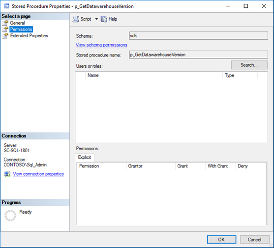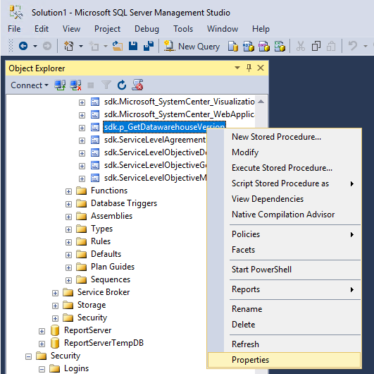 From the stored procedures list, find and select the p_GetDatawarehouseVersion ; right-click on it and select Properties.