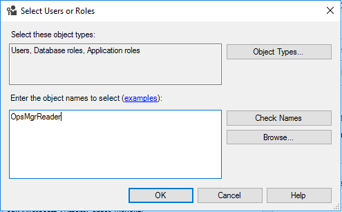 Click on the Search button and in the Select Users or Roles type the OpsMgrReader role name