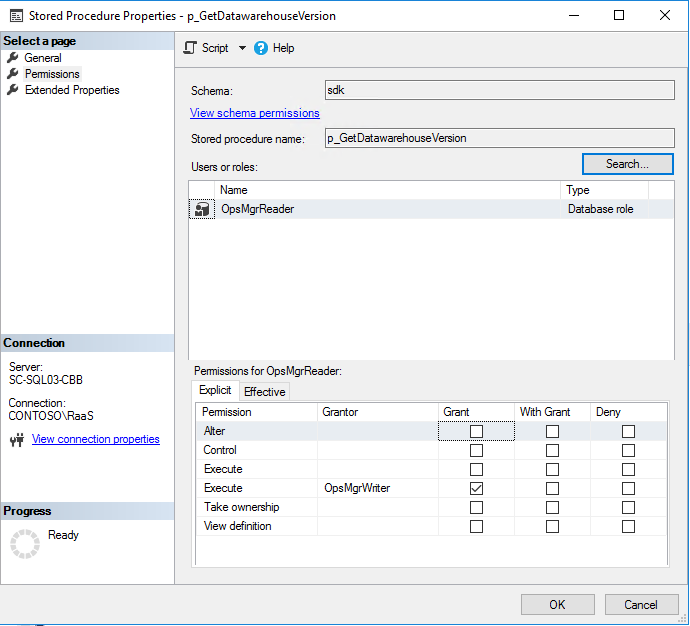 On new installations, the event is generated with this string in the description: The EXECUTE permission was denied on the object ' p_GetDatawarehouseVersion ', database 'OperationsManagerDW', schema 'sdk'.).