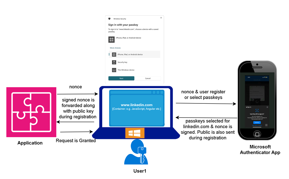 Let’s begin by understanding how the registration of a passkey works. When a user accesses a website or Relying Party (RP), such as www.linkedin.com , that supports passkeys from a Windows client via a browser, the website or RP sends a nonce (a one-time random value) to the browser. The browser, running on the client device, forwards that nonce to the authenticator, in this case, the Microsoft Authenticator App. The client prompts the user to select an authenticator. The user can choose another device, such as an iPhone, iPad, or Android device running the Microsoft Authenticator App, or a physical security key.