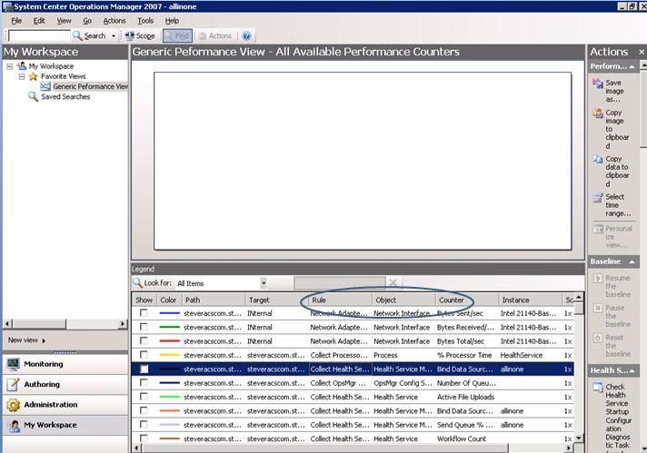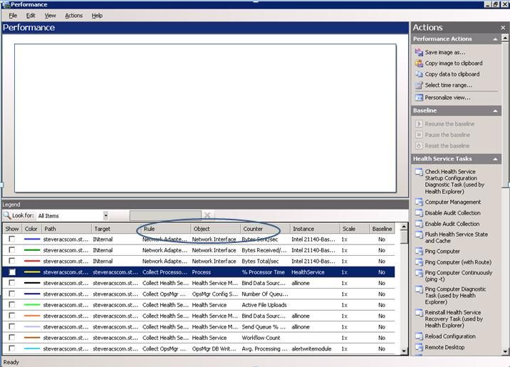 In order to display performance data in a view we must have a RULE to collect data from the specific counter of interest. Notice I wrote RULE in all capital letters. I did that to make a point. In OpsMgr 2007 all data collection (events, perf, whatever) is handled by rules - not monitors. Monitors are solely used for monitoring health state. Rules are used for any data collection. So thats where we need to look - do we have a rule that is configured to collect the peformance counter we are interested in? Assuming we have named all of our performance rules with the name of the counters they collect - all we have to do is search the rule names and see if any rule exists. But, in practical terms, it very likely isn't that easy. Assume, for example, that we have a performance collection rule titled Netlogon Performance Rule 1. That rule is configured to collect data from the new (available with hotfix 928576) 'average semaphore hold time' performance counter. Unless we know this particular rule is the one that collects that counter it is difficult to find. But there is a very easy way to determine all of the performance counters OpsMgr knows about and are configured for data collection - and what rule is actually doing the work to collect the data!