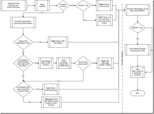 - The 'results' function is used to write to the eventlog and send SMTP messages. Event levels are controlled in the variable section. For example a failed CRL copy you want to make sure the eventlog show "Error" ($EventHigh)