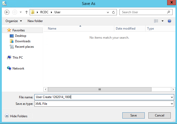 - For the File Name I recommend naming the file something that not only makes it easy to identify which RCDC this XML file is for but when you saved it. In this example i used a format (Identification and date and time) For Example User Create Identifies this XML File is for the Configuration for User Creation RCDC, and 126214_1800 Identifies the date and time this XML file was saved. (1262014_1800 = December 6, 2014 06:00 PM) The reason i name these files this way is when your modifying RCDCs its important to make your modifications 1 step at a time making changes to 1 attribute at a time, saving and testing this file each step of the way.
