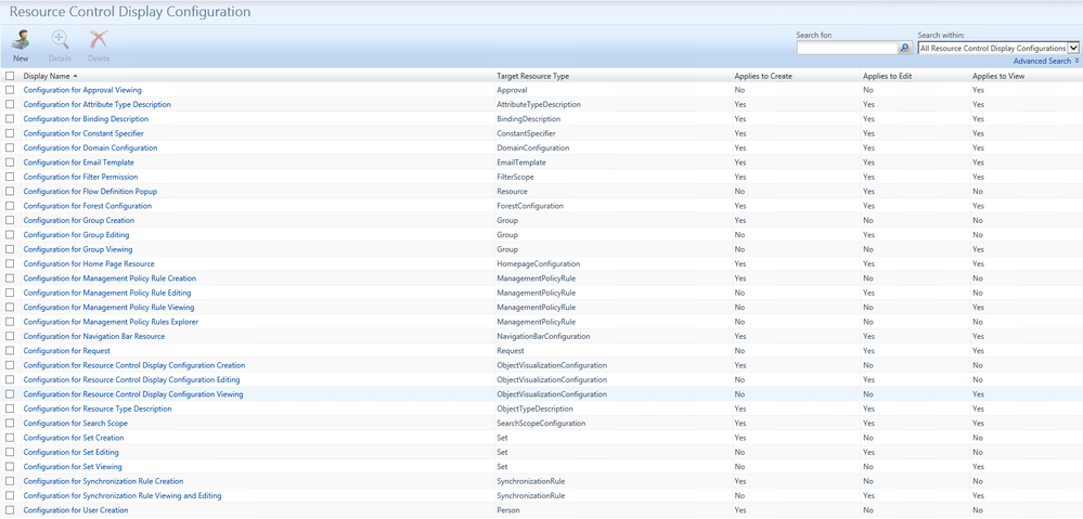 - Once you locate the RCDC Configuration for User Creation, Notice the 2nd column which represents Target Resource Type tells you what resource this RCDC is for.