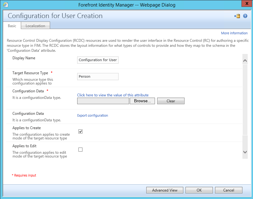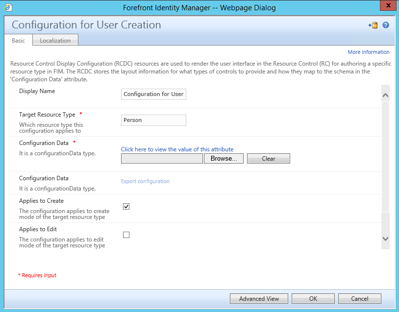 - Within this window you could change the Display Name and Target Resource Type if desired but i would strongly not recommending changing the Target Resource Type section which essentially binds this RCDC to the User resource with in the FIM Portal. It may also be important to note that you should only ever have 1 RCDC set for each resource type and action. (Another words do not change the following 2 options)
