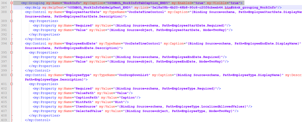 - Now locate the section the represents the Work Info Tab, this is represented with the line <my:Grouping my:Name="WorkInfo" my:Caption="%SYMBOL_WorkInfoTabCaption_END%" my:Enabled="true" my:Visible="true">