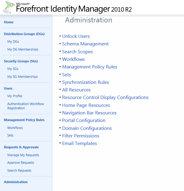 - Now go back to the FIM Portal Page, notice it may take a few extra moments to load the page, this is normal behavior after an IISRESET